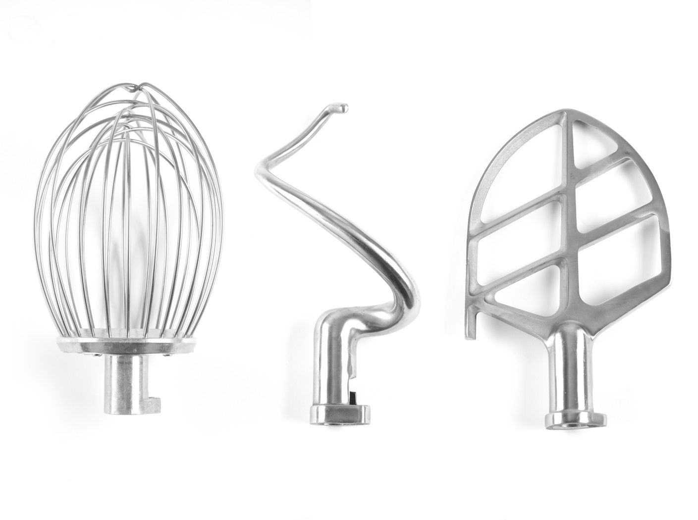 Incluye cuenco, batidor, batidor, mezclador y gancho de masa de acero inoxidable.