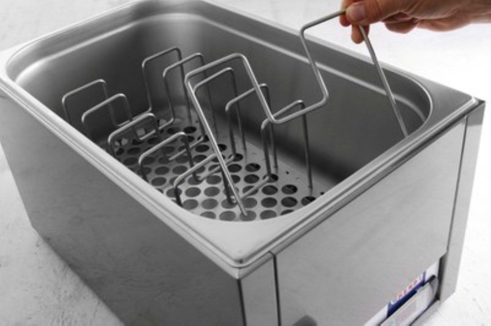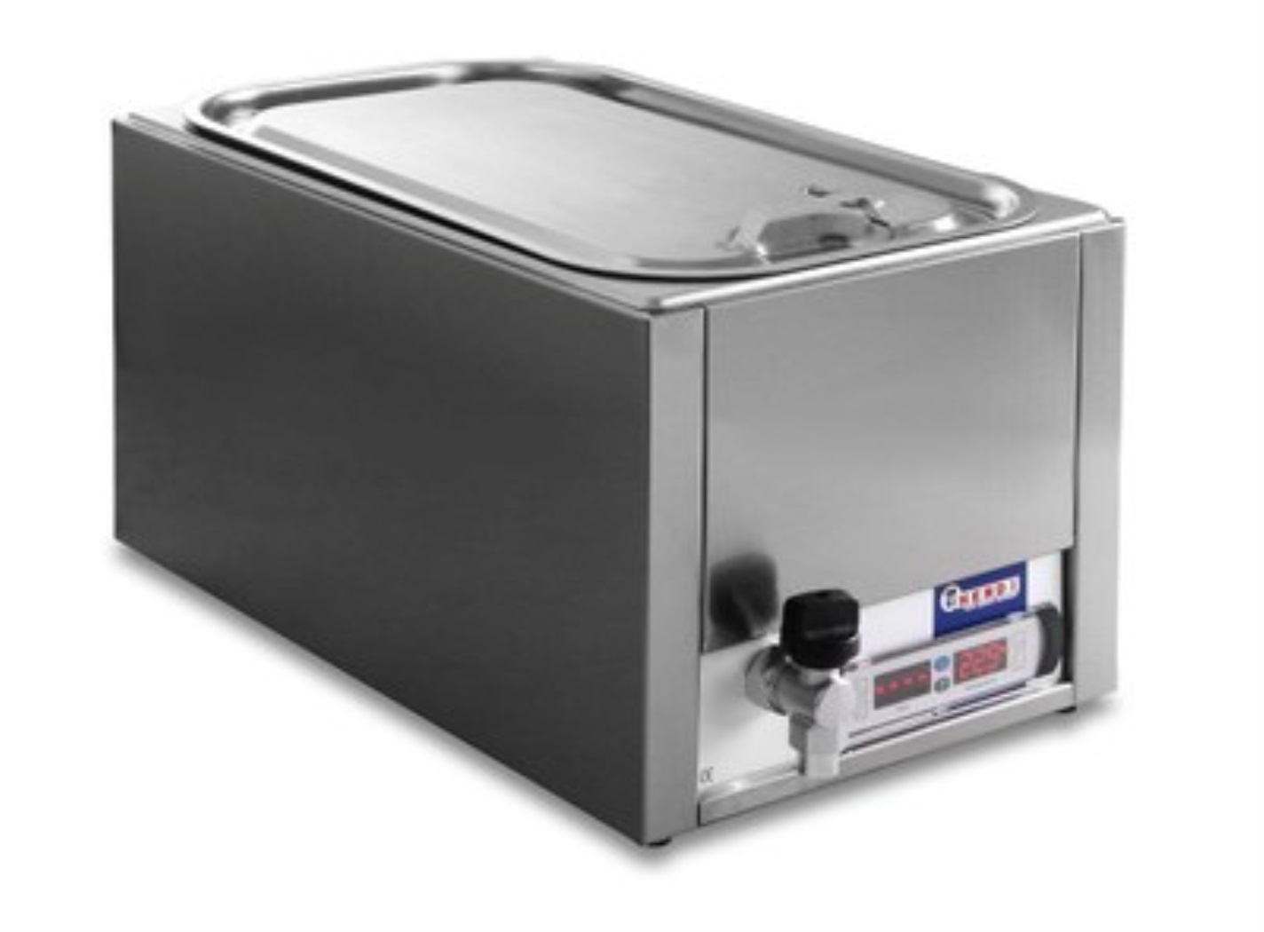 Sistema de cocción de culata donde los alimentos envasados en bolsas de vacío de plástico se cocinan a una temperatura controlada con precisión