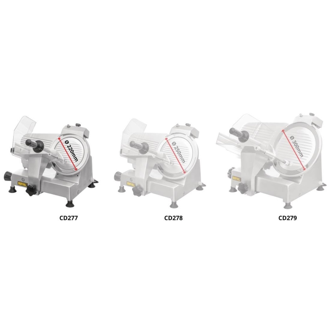 Resistente y segura, esta cortadora de carne Buffalo es ideal para cortar jamón, ternera, aves o verduras. Ya sea el negocio que dirija, bien una charcutería o un bar, esta cortadora proporciona total control en el porcionado y reduce el desperdicio gracias a su control de cortado, y a sus hojas regulables y precisas. Cuando termina el troceado, la máquina se desmonta para limpiarla facilmente. Segura, potente y fácil de usar. No es apta para utilizarla con queso.