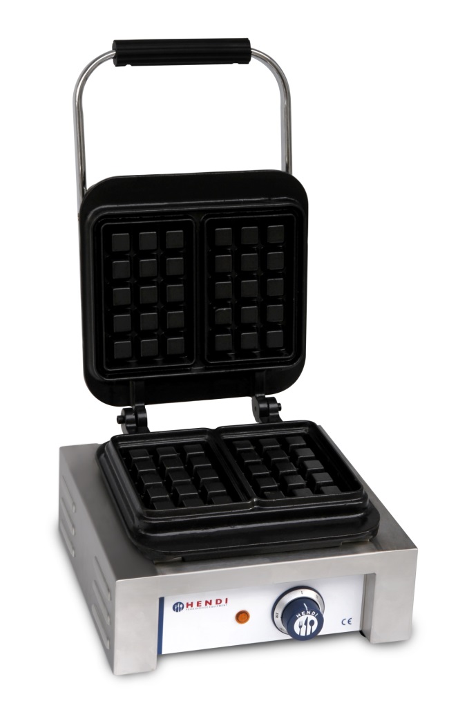gofres de Bruselas, dos patrones rectangulares 3x5. Hojas para hornear de hierro fundido con capa antiadherente. Control de temperatura termostático. Incluye un tenedor de gofres. Mango aislado. Nuevo. Acero inoxidable.