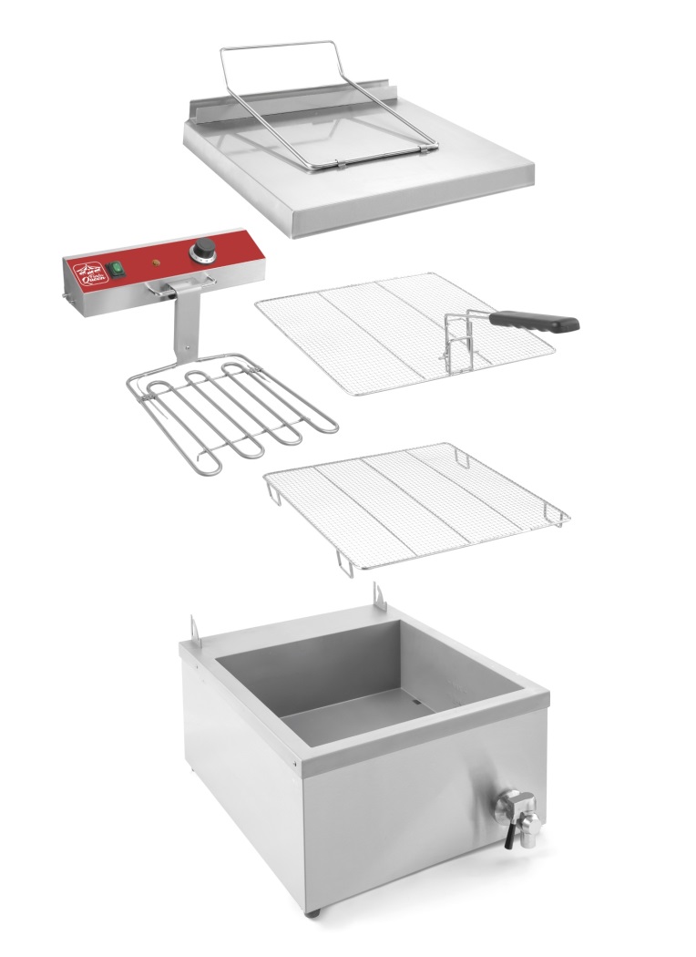 Ideal para freír rosquillas, buñuelos, globos de aceite y otras masas fritas. Hecho enteramente de acero inoxidable, viene con dos rejillas para hornear (354x383mm) con un mango de enfriamiento, una rejilla de calentamiento y una tapa que también puede servir como una caja de escape. Fácil de usar y limpiar, adecuado para uso intensivo y grandes cantidades. Equipado con un gran tanque de aceite soldado (400x400x (H)160 mm) con un máx. capacidad de 12 litros. Tanque equipado con grifo y marcas de nivel de aceite mínimo / máximo, tiene una 'zona fría' para mejorar el tiempo de uso del aceite. Elemento calefactor extraíble con función de desconexión al retirar y protección contra el sobrecalentamiento. La temperatura se puede ajustar de 50o a 190oC. Luz de indicación de calefacción para indicar si el elemento calefactor funciona. Con pies antideslizantes de goma. Nuevo. Acero inoxidable.