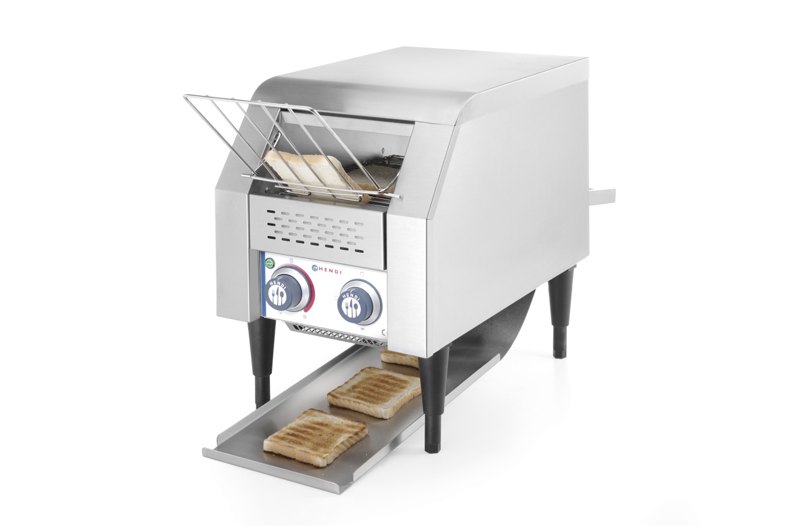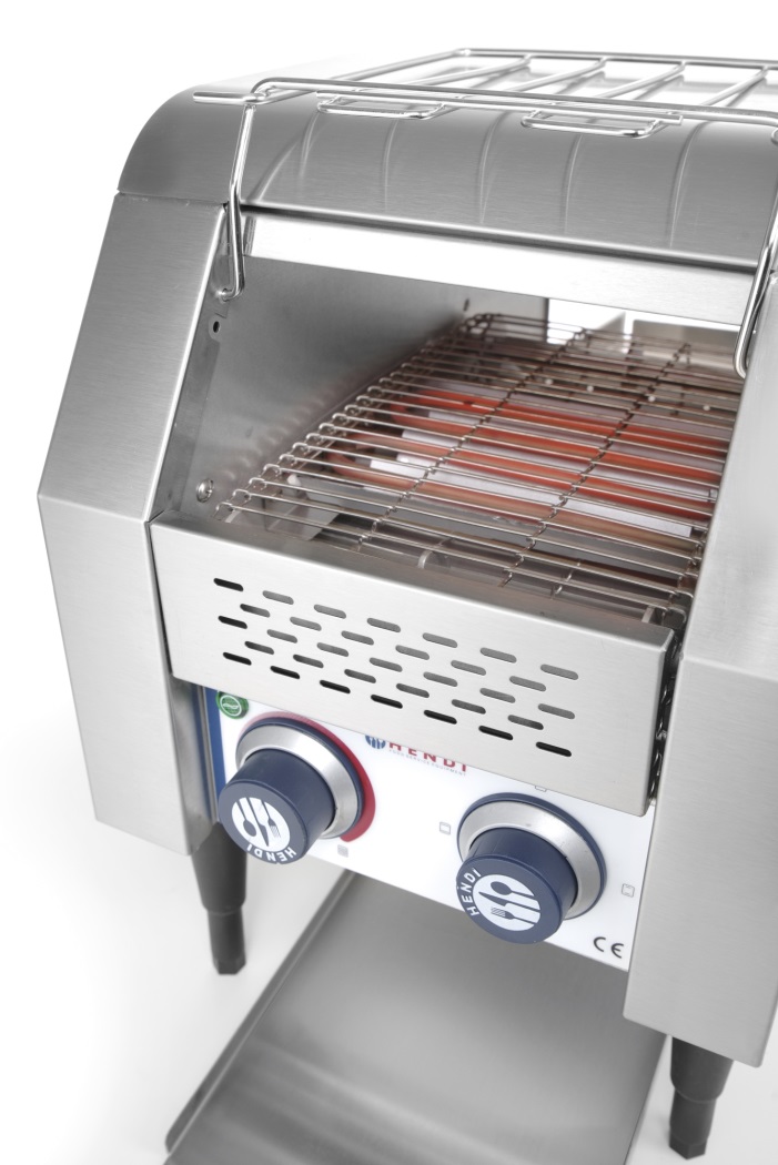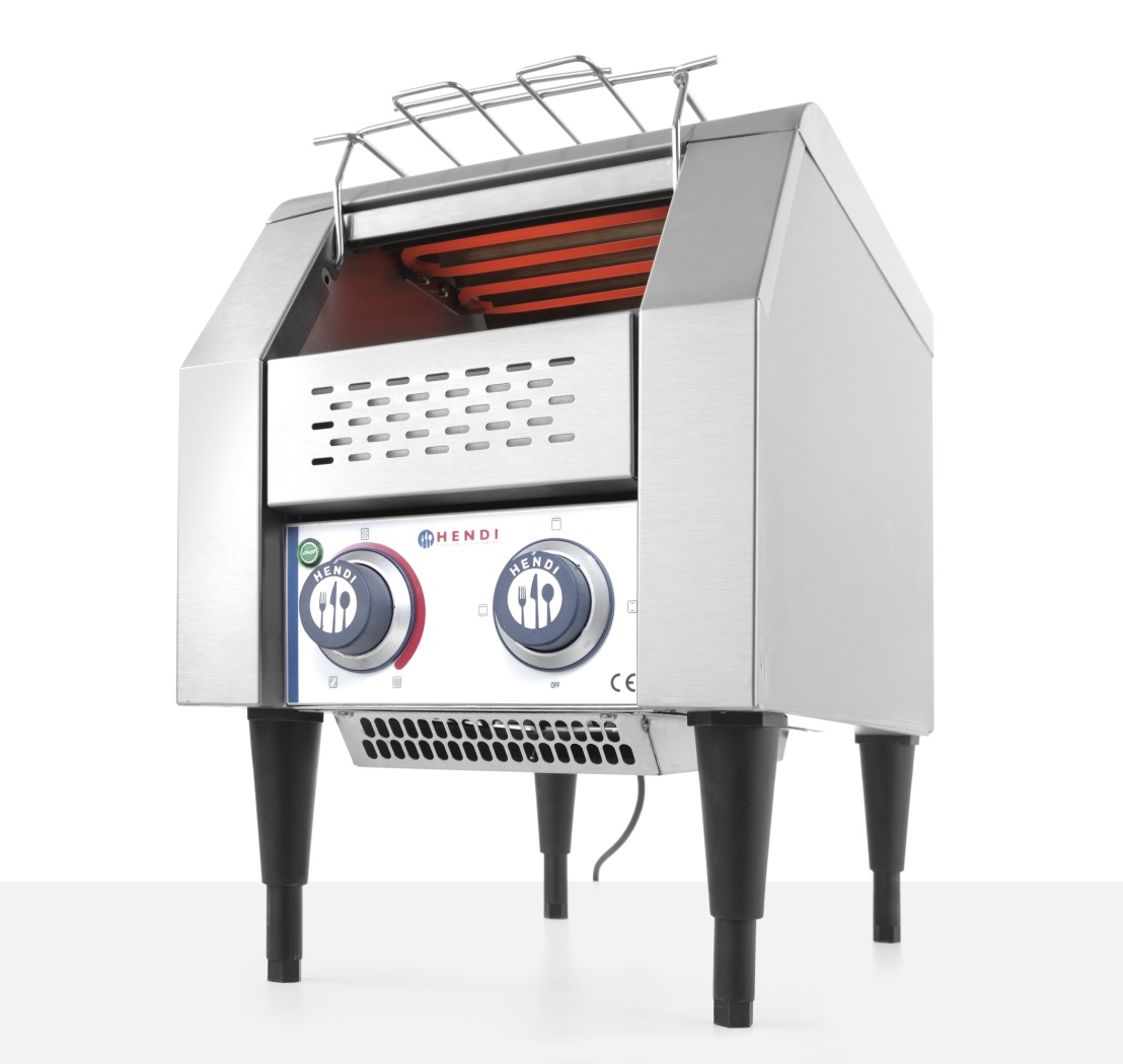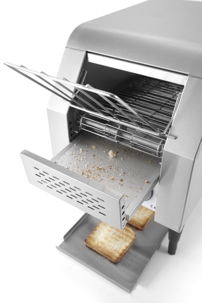 y fila de rebanadas cabe en la cinta de correr. Equipado con dos elementos separados, uno superior y otro abajo. Adecuado para rebanadas de pan tostado continuo. Con receptáculo delantero y trasero. Tiempo de respuesta ajustable hasta 5 minutos. Acero inoxidable.