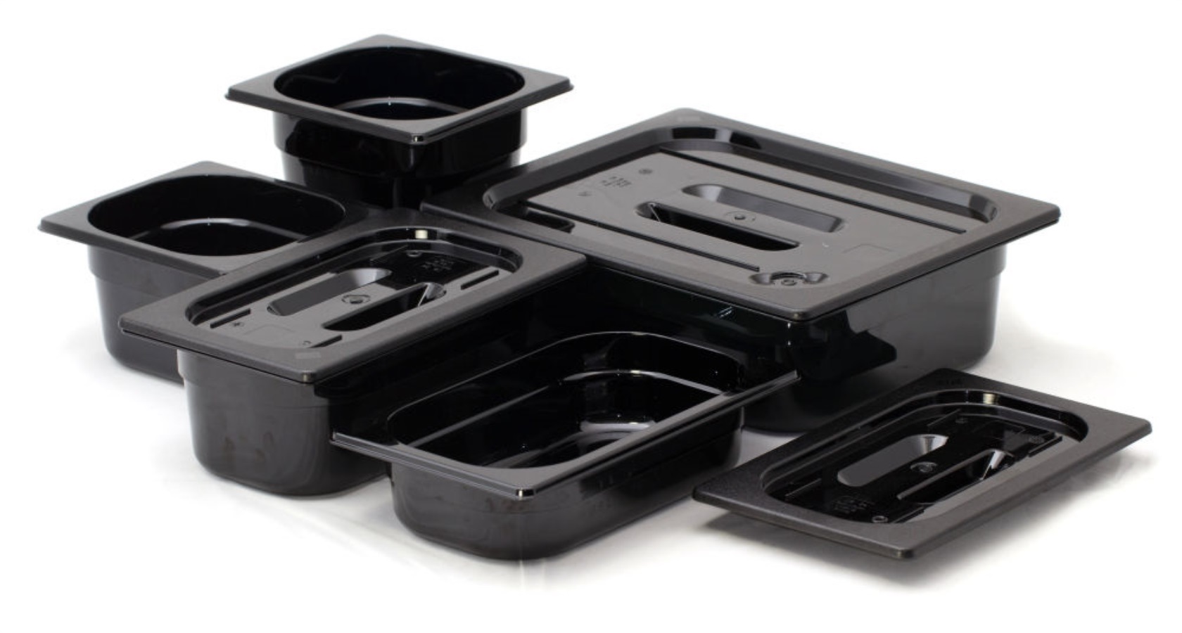 Productos profesionales de alta calidad de Gastronorm hechos de policarbonato negro. Libre de olores y sin sabor. Adecuado para lavavajillas. Policarbonato. Apilable. Resistente a la temperatura de -40o a 110oC.