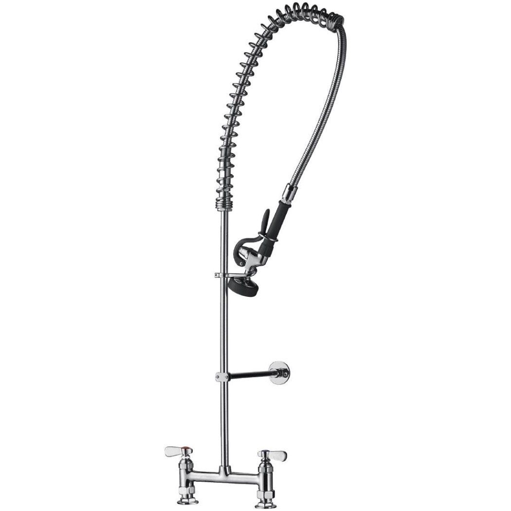 Enjuague de platos y batería antes del lavavajillas para máximos resultados de limpieza. Con un cuello de cisne accionado por resorte y un cartucho cerámico de de giro para evitar fugas, ambas unidades de pre-aclarado son robustas y duraderas para un uso frecuente. Monobloc - alimentación de agua doble con grifos mezcladores.