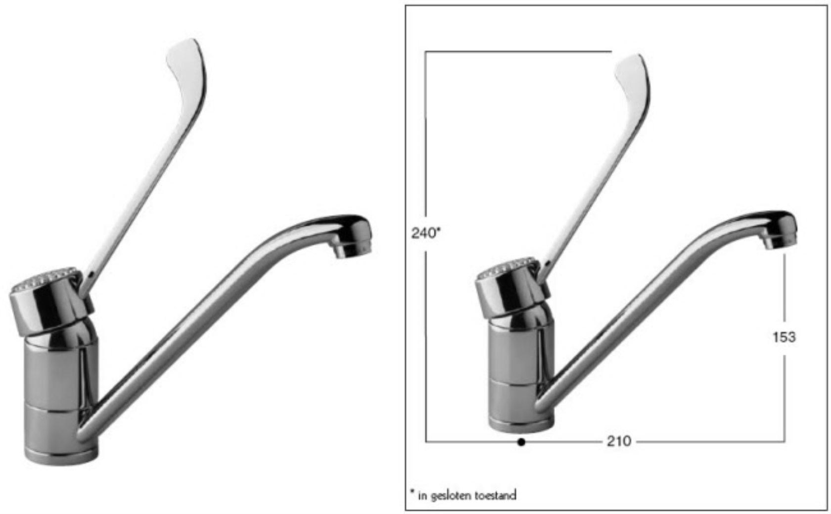 - Un grifo mezclador de palanca con boquilla de 21cm - éenpuntsbladmontage - Equipado con una palanca extra larga - 'Control de codo' - Materiales de montaje incluidos