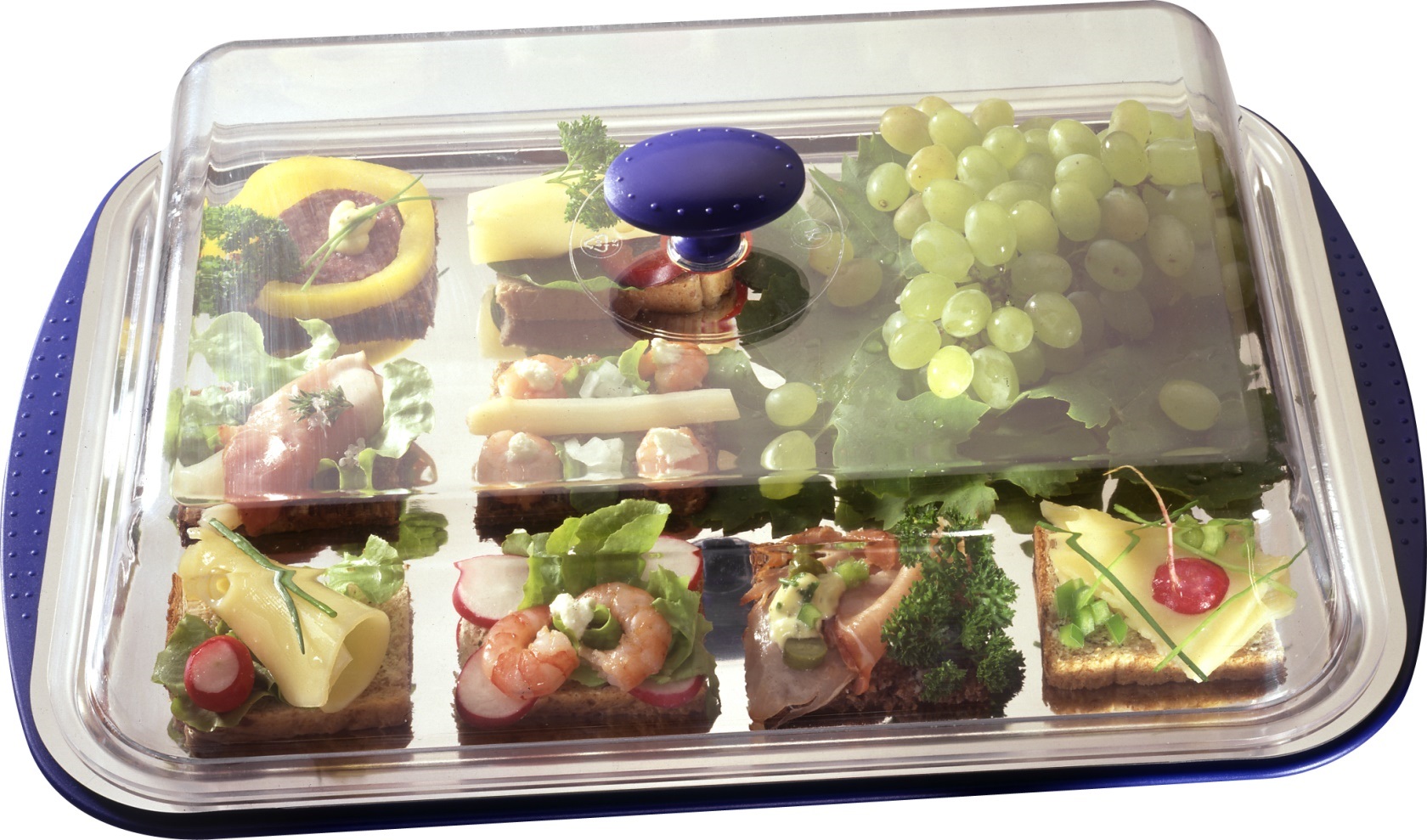 juego de 5 piezas, soporte de plataforma ABS plástico con capucha transparente de plástico PS. Incluye meseta de acero inoxidable y 2 elementos de refrigeración. Plástico ABS. Función de refrigeración.