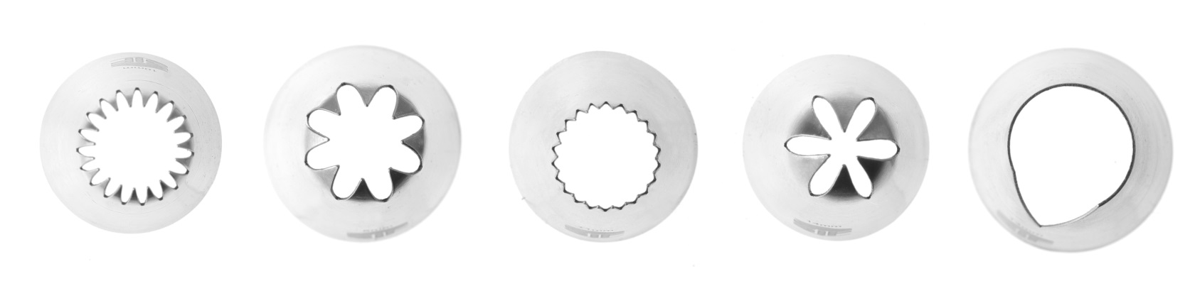 Set consta de 5 bocas de pulverización para la decoración:- 2x estrella cerrada - 1x gota Flor. - 1x estrella francesa. - 1x en forma de V. Extra preciso gracias a los bordes afilados. Acero inoxidable 18/8.