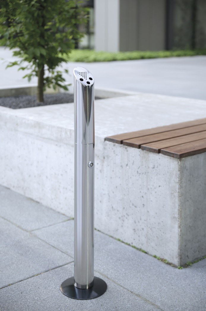 Diseño muy robusto, se puede montar en el suelo o gratis. Fácil de vaciar, la parte superior se puede desbloquear con una llave y luego vaciar. El pie es de 170 mm, la columna es de 80 mm. Nuevo. Acero inoxidable 18/8.