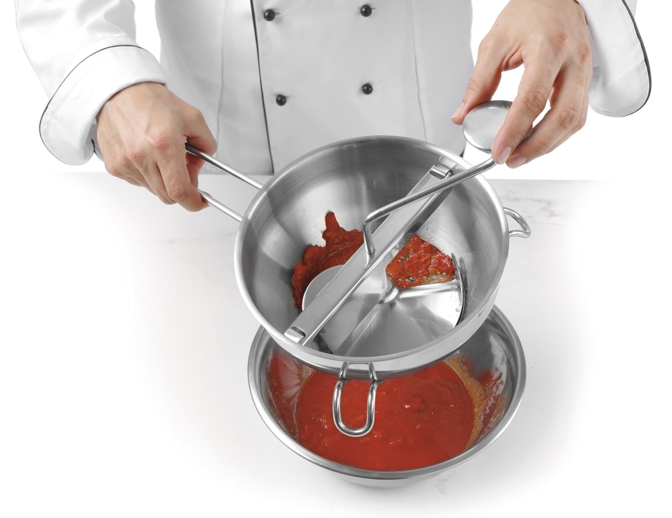 Muy adecuado para la preparación de sopa encuadernada y salsa de tomate. Incluye 2 siete (140 mm), grueso y fino. Adecuado para lavavajillas. Acero inoxidable 18/10.