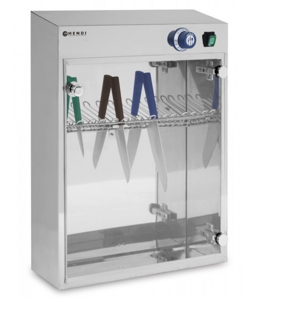 Perfecto para esterilizar cuchillos, capacidad 14 cuchillos. Fabricado en acero inoxidable con puerta de plexiglás. Incluye soporte de cuchillas de acero inoxidable. Esterilizada por la luz ultravioleta que mata bacterias. Equipado con microinterruptor para evitar el cambio de puerta abierta. Temporizador incorporado ajustable a 60 minutos. Nuevo. PMMA (Plexiglas). Acero inoxidable.