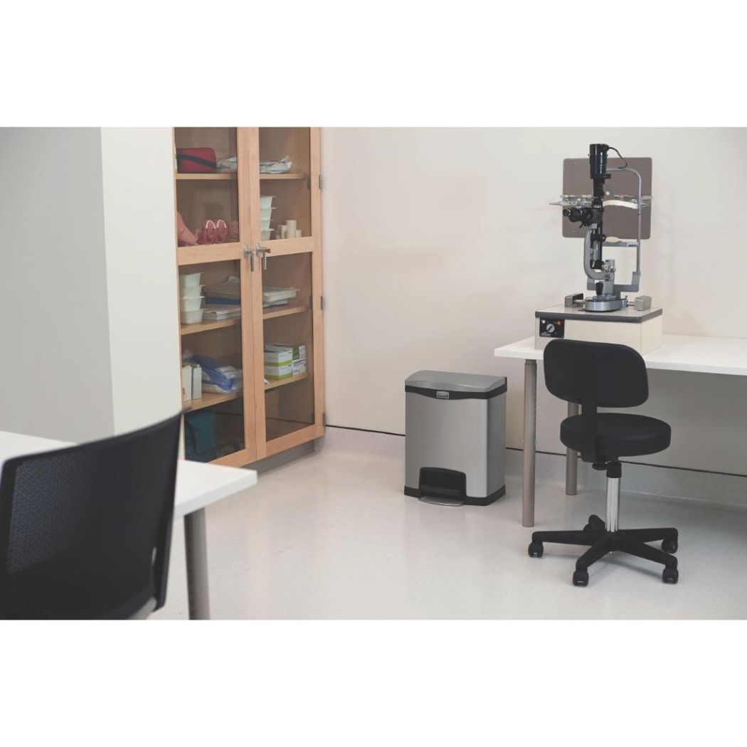Cubos Rubbermaid Slim Jim® de diseño estilizado y discreto y fabricado en acero inoxidable antihuellas. Maximiza el espacio y mínimo mantenimiento. Bisagra interna que evita daños en las paredes al abrir la tapa y tapa de cierre silencioso.