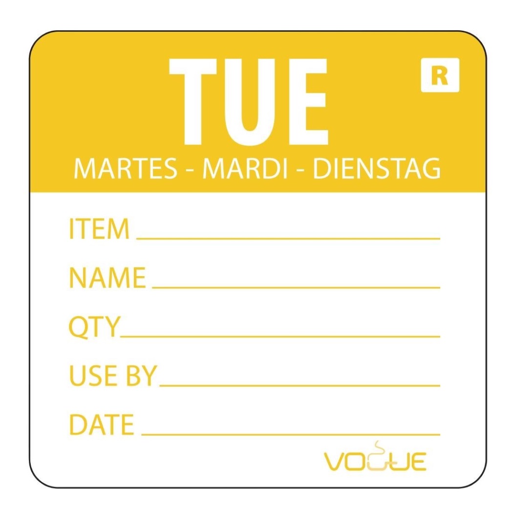 Etiquetas de seguridad alimentaria codificadas por colores que se corresponden al sistema de rotación 'día de la semana'. Sepa de un vistazo cuándo se preparó un alimento. Indica la 'fecha de caducidad' en los alimentos listos para consumir. Fáciles de eliminar, no dejan residuos. En rollos de 500. Disponible en rollos individuales o en juegos de 7 rollos: uno por día de la semana.