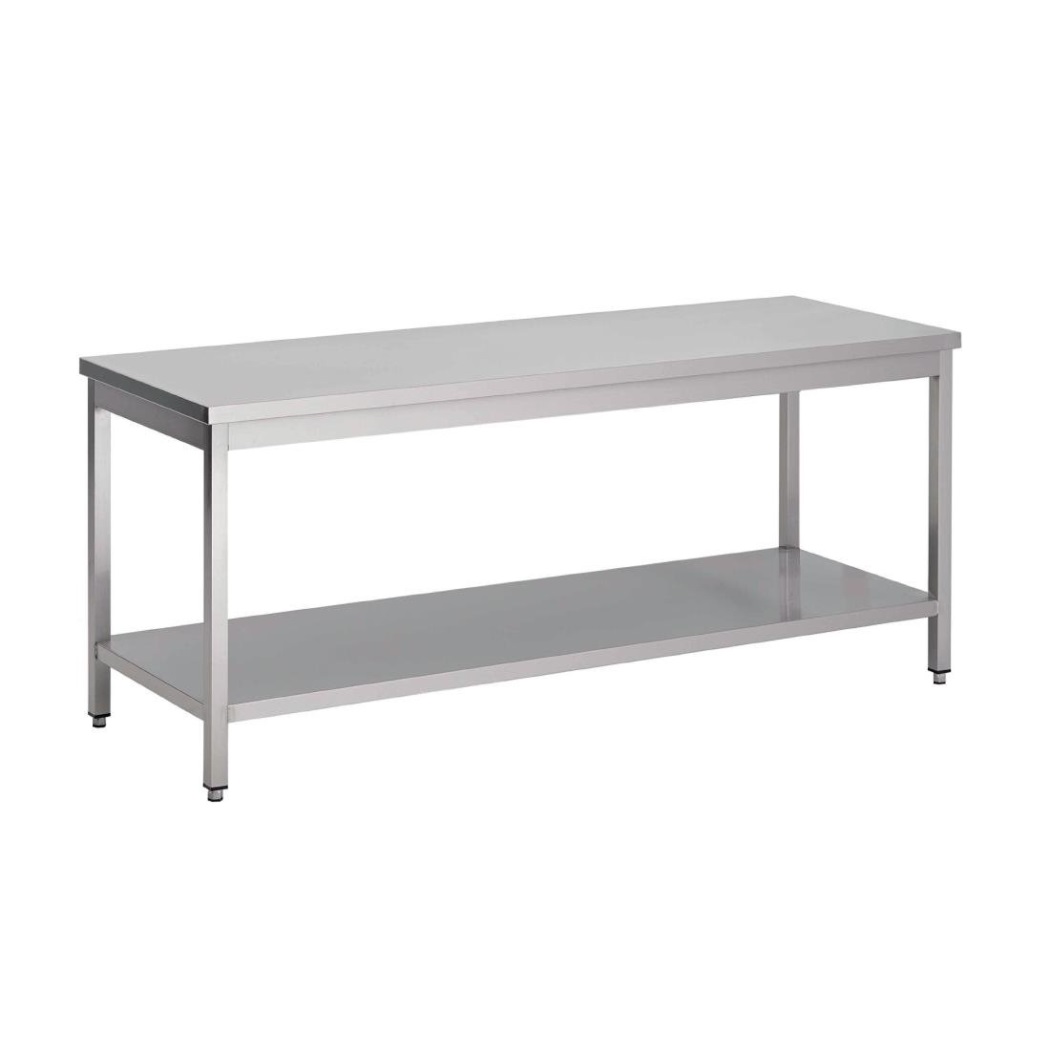 Mesa de preparación Gastro-M fabricada totalmente en acero inoxidable AISI 430. Altura standard de 85cm que puede llegar a 92cm gracias a los pies regulables. Tablero reforzado con chapa de melamina de 18mm de grosor. Patas cuadradas 4x4cm.