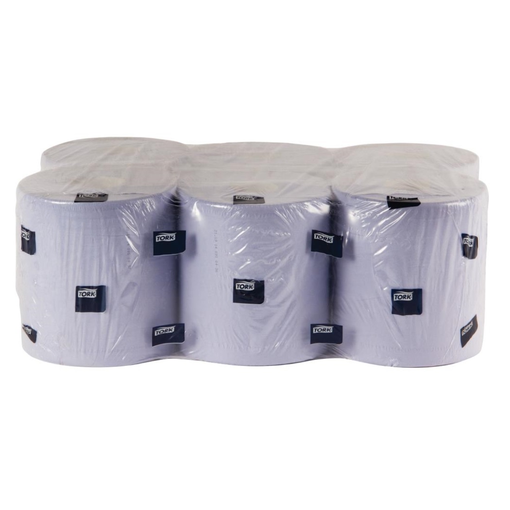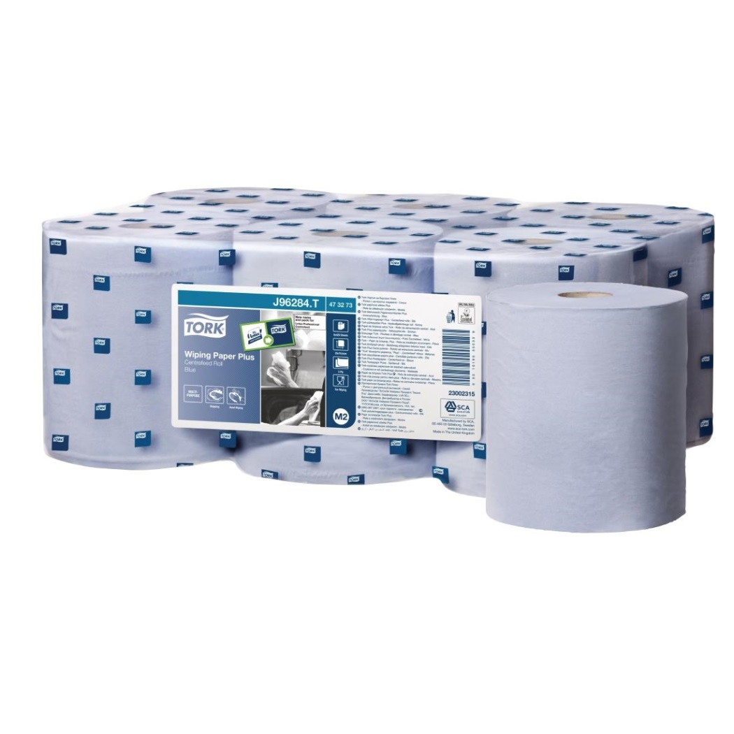 Rollos mecha de toallas azules, una alternativa higiénica a las toallas textiles. Aptos para uso con el dispensador Tork Y044.