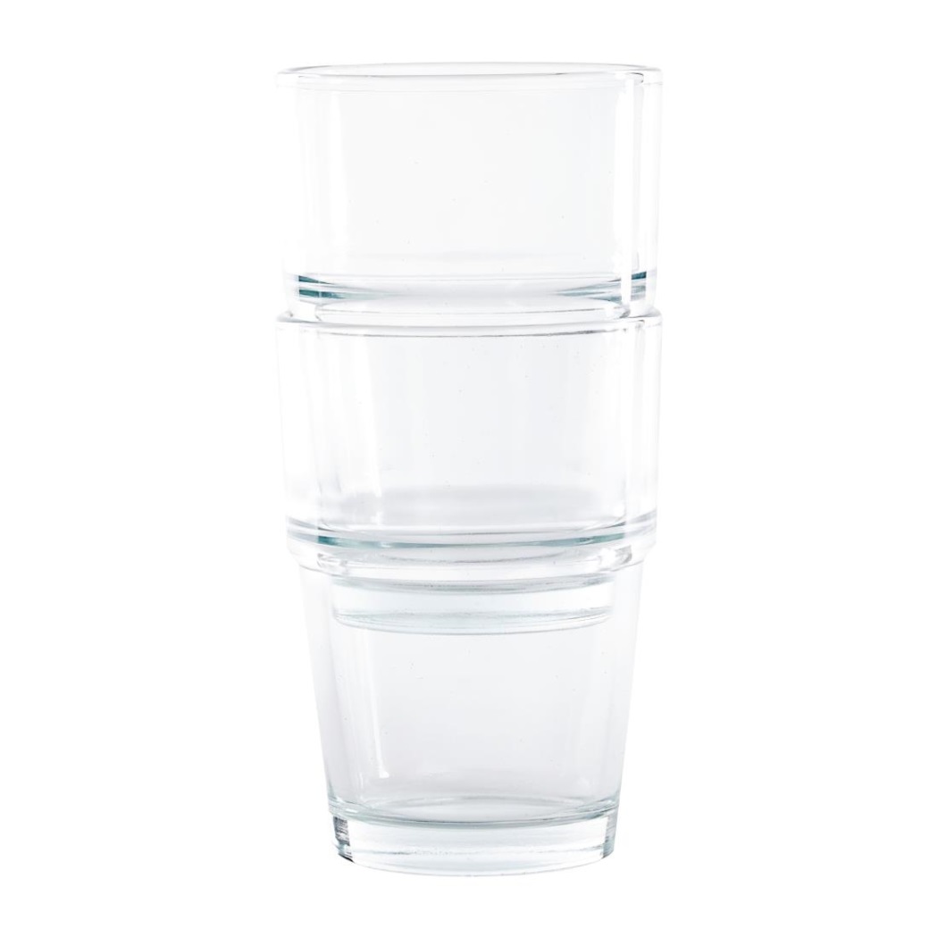 Vasos bajos de vidrio totalmente endurecido, elegantes y apilables, perfectos en una gran variedad de establecimientos.