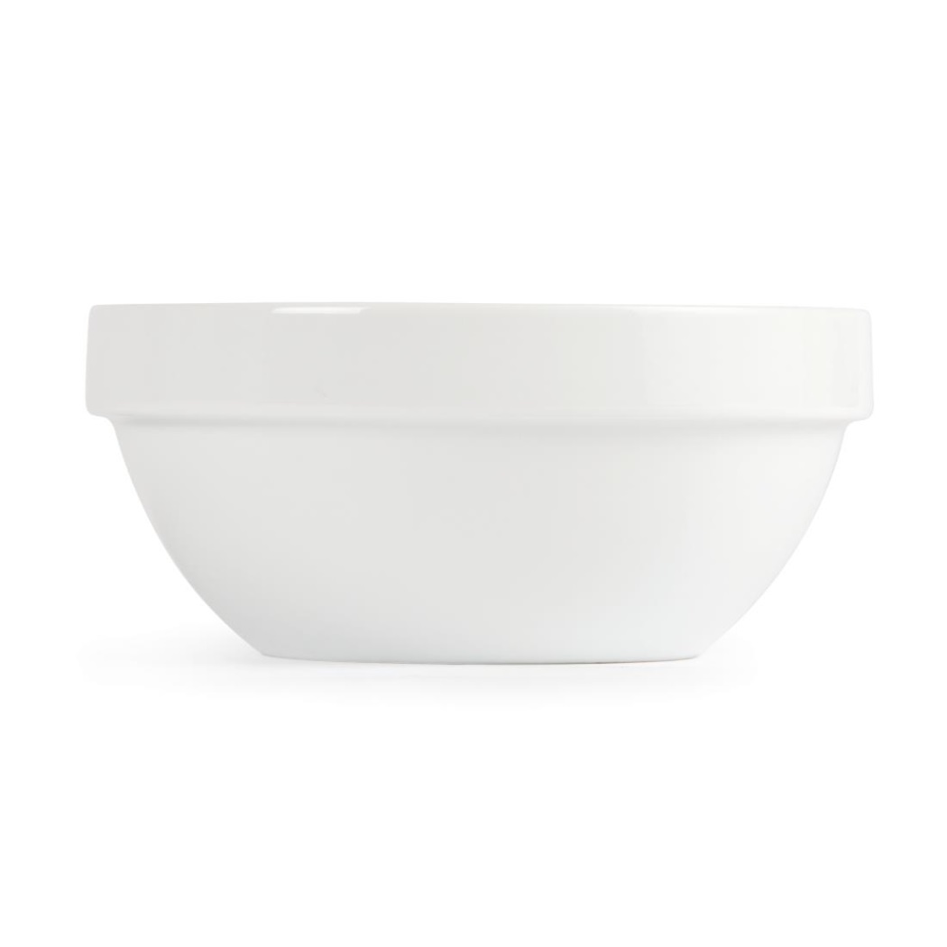 Artículos de hostelería de porcelana blanco nieve muy rentables Apilables con bordes redondeados reforzados para resistir a los golpes. Totalmente vitrificados para garantizar la durabilidad del vidriado. Apto para el horno, microondas, lavavajillas y congelador.