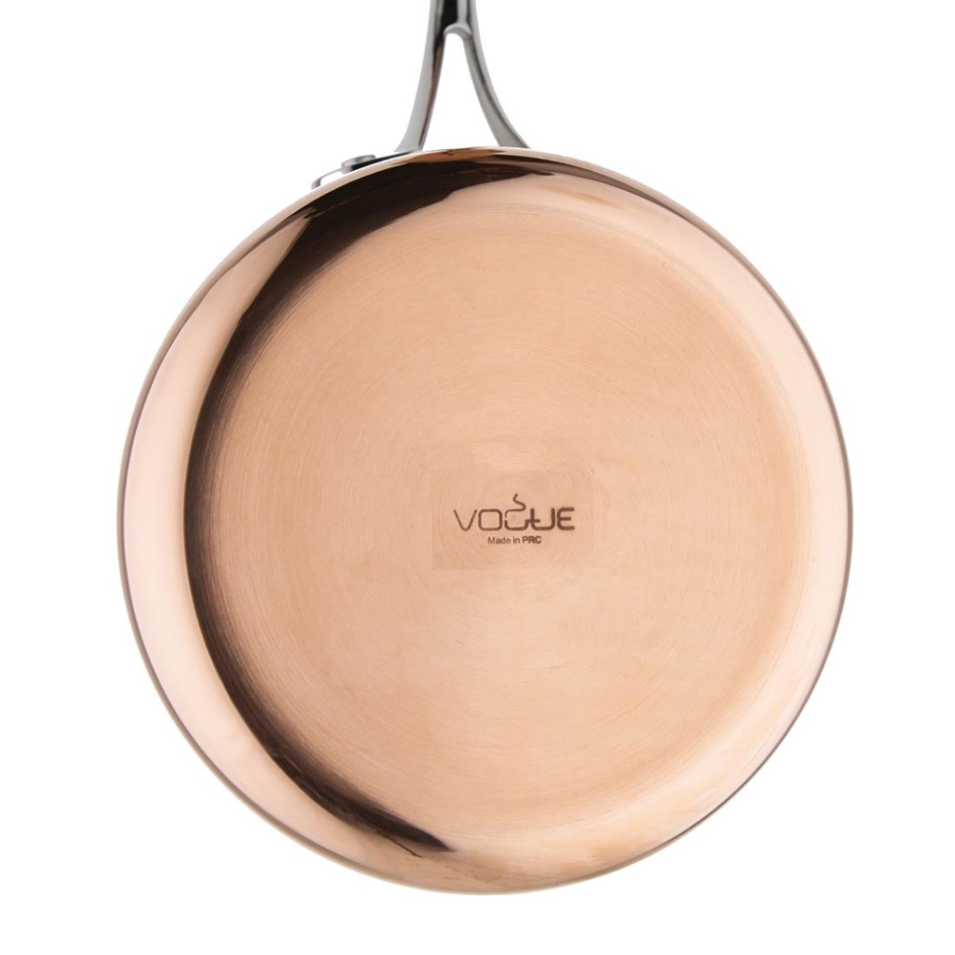 Menaje de cocina de alta calidad fabricado con un núcleo de aluminio recubierto de acero inoxidable cuya capa externa está recubierta a su vez de cobre. Esta construcción de triple pared (Triwall) permite una distribución uniforme del calor y unos óptimos resultados de cocción. Interior en acabado cepillado y exterior acabado pulido.