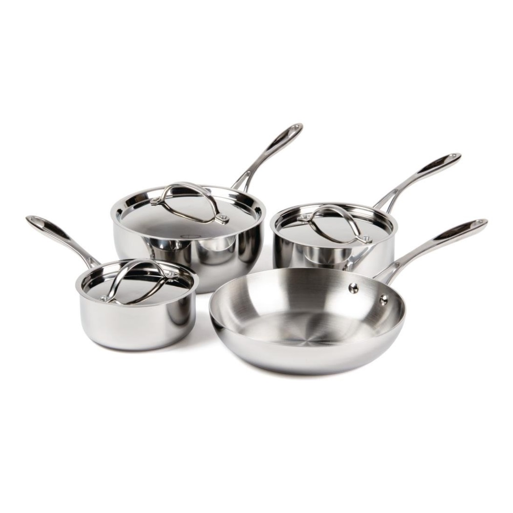 Sartén de calidad profesional. Capa interna de alumino térmico embutida entre capas de acero inoxidable, para una distribución uniforme del calor