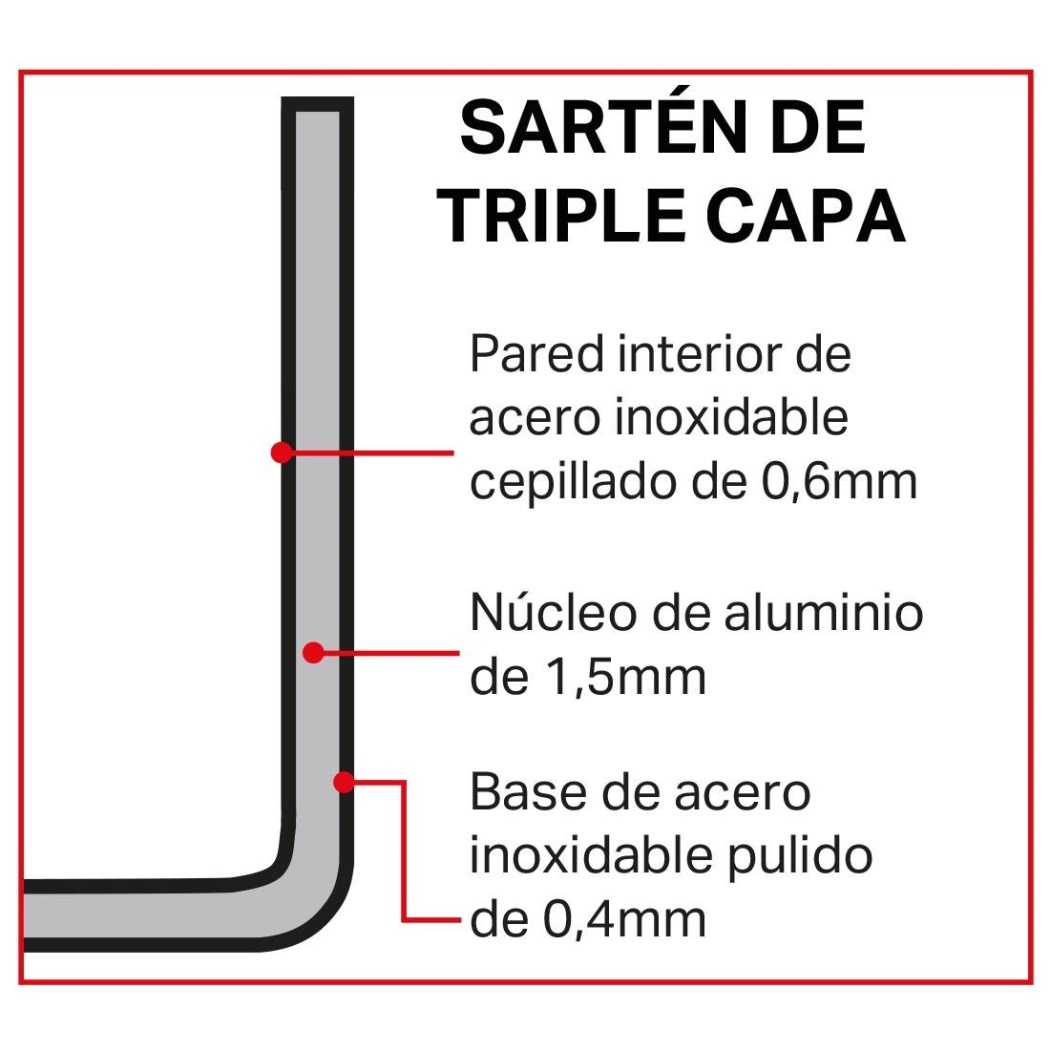 Menaje de cocina de alta calidad fabricado con un núcleo de aluminio recubierto de acero inoxidable cuya capa externa está recubierta a su vez de cobre. Esta construcción de triple pared (Triwall) permite una distribución uniforme del calor y unos óptimos resultados de cocción. Interior en acabado cepillado y exterior acabado pulido.