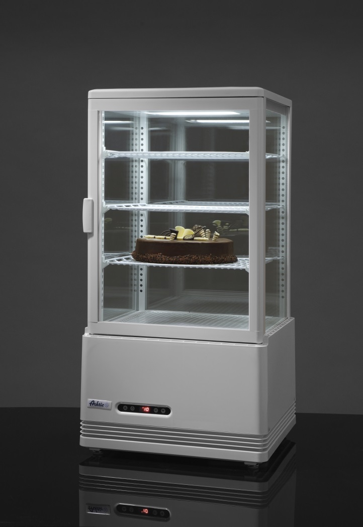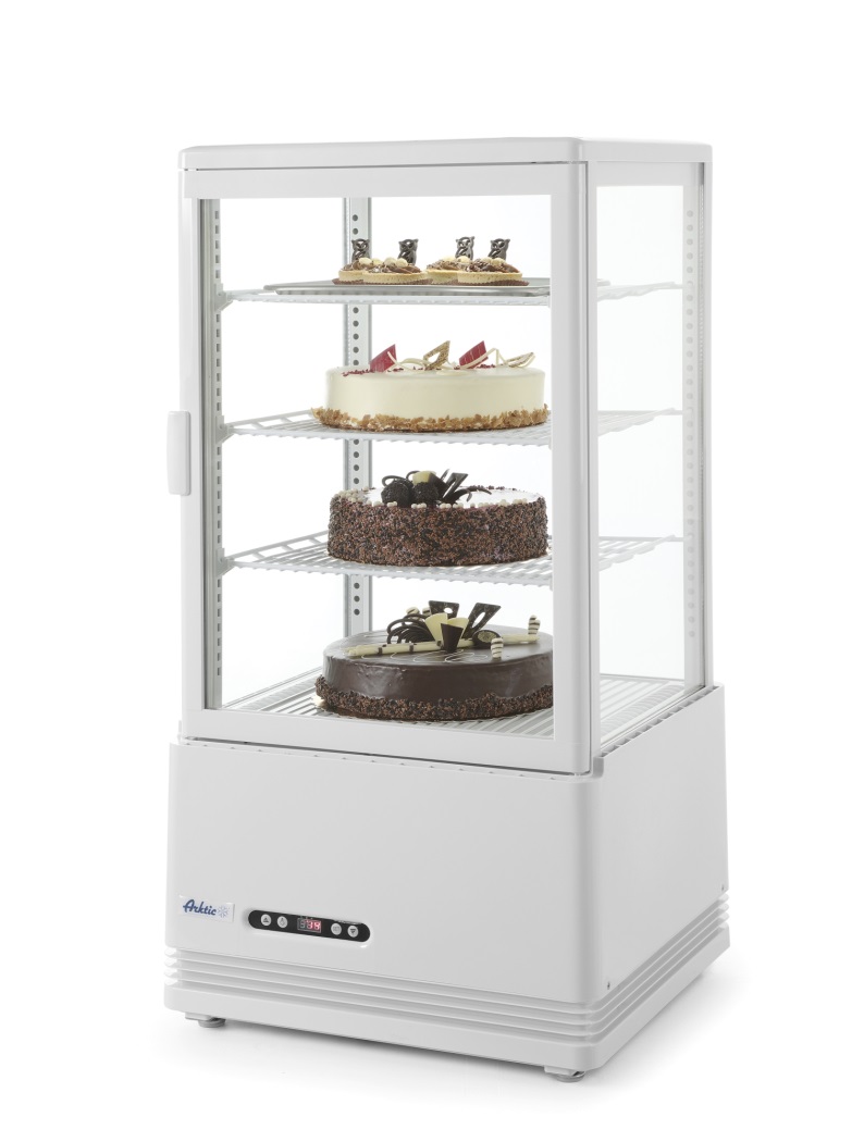 Vivienda de acero inoxidable recubierto con doble acristalamiento. Con puerta de cierre automático. Refrigeración por aire forzada con descongelación automática, compresor colocado debajo de la sala de refrigeración. El conducto de aire fuera del vidrio sopla aire sobre el vidrio para eliminar y evitar la condensación. Tablones duraderos con revestimiento de PVC, ajustables en altura. Con clara iluminación LED en el techo. Controlador de temperatura digital y pantalla. Rango de temperatura: 2/6o C. Clase climática: 4. Refrigerante: R600A. Con 3 estantes y patas ajustables en altura. Acero inoxidable.