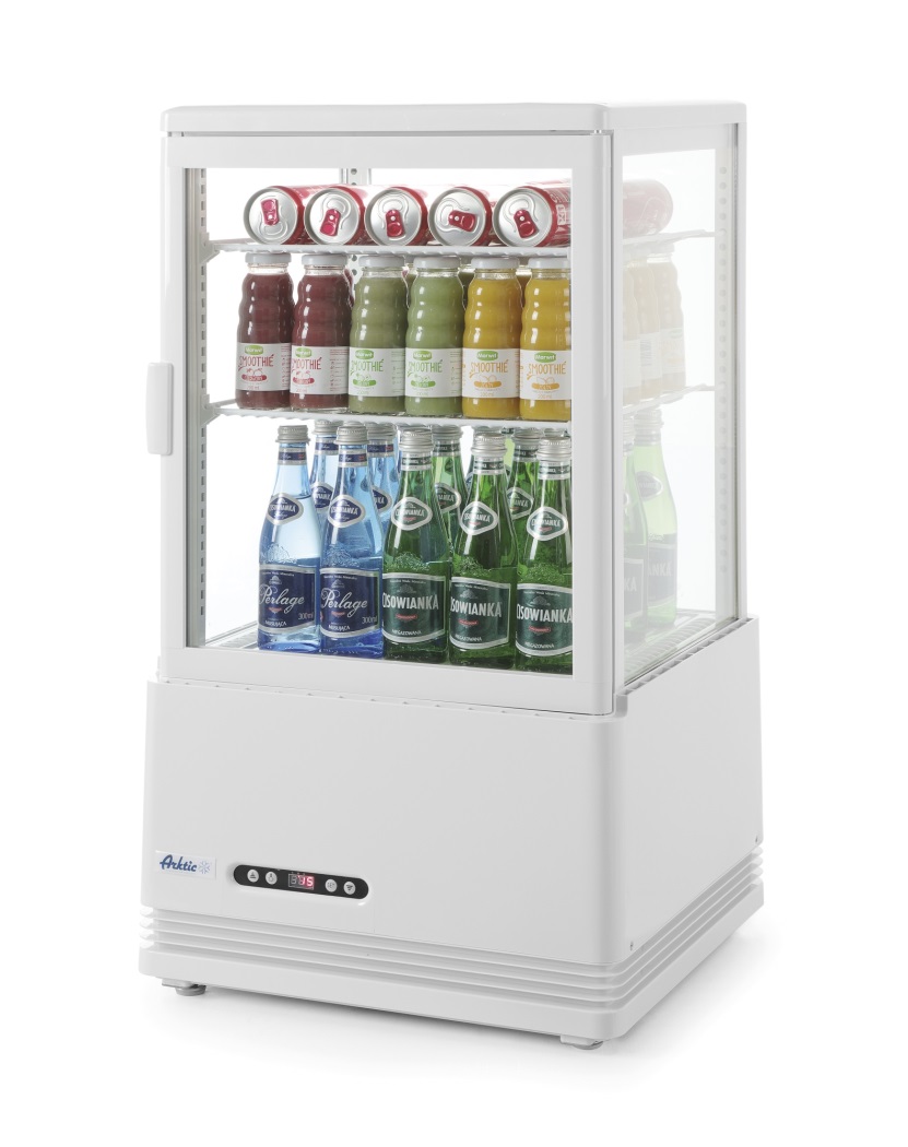 Vivienda de acero inoxidable recubierto con doble acristalamiento. Con puerta de cierre automático. Refrigeración por aire forzada con descongelación automática, compresor colocado debajo de la sala de refrigeración. El conducto de aire fuera del vidrio sopla aire sobre el vidrio para eliminar y evitar la condensación. Tablones duraderos con revestimiento de PVC, ajustables en altura. Con clara iluminación LED en el techo. Controlador de temperatura digital y pantalla. Rango de temperatura: 2/6o C. Clase climática: 4. Refrigerante: R600A. Con 2 estantes y patas ajustables en altura. Acero inoxidable.