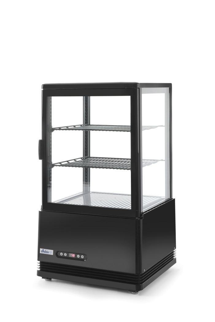 Vivienda de acero inoxidable recubierto con doble acristalamiento. Con puerta de cierre automático. Refrigeración por aire forzada con descongelación automática, compresor colocado debajo de la sala de refrigeración. El conducto de aire fuera del vidrio sopla aire sobre el vidrio para eliminar y evitar la condensación. Tablones duraderos con revestimiento de PVC, ajustables en altura. Con clara iluminación LED en el techo. Controlador de temperatura digital y pantalla. Rango de temperatura: 2/6o C. Clase climática: 4. Refrigerante: R600A. Con 2 estantes y patas ajustables en altura. Acero inoxidable.