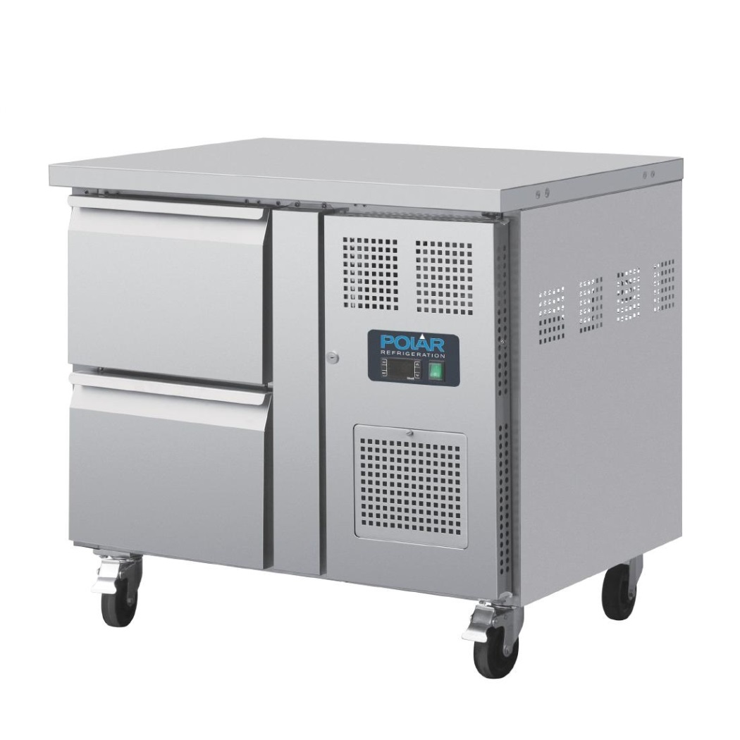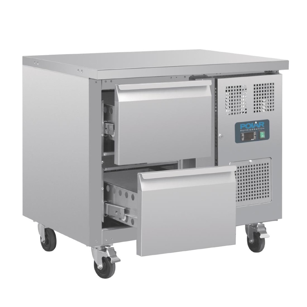 Mostrador refrigerado con cajones fabricado en resistente acero inoxidable.