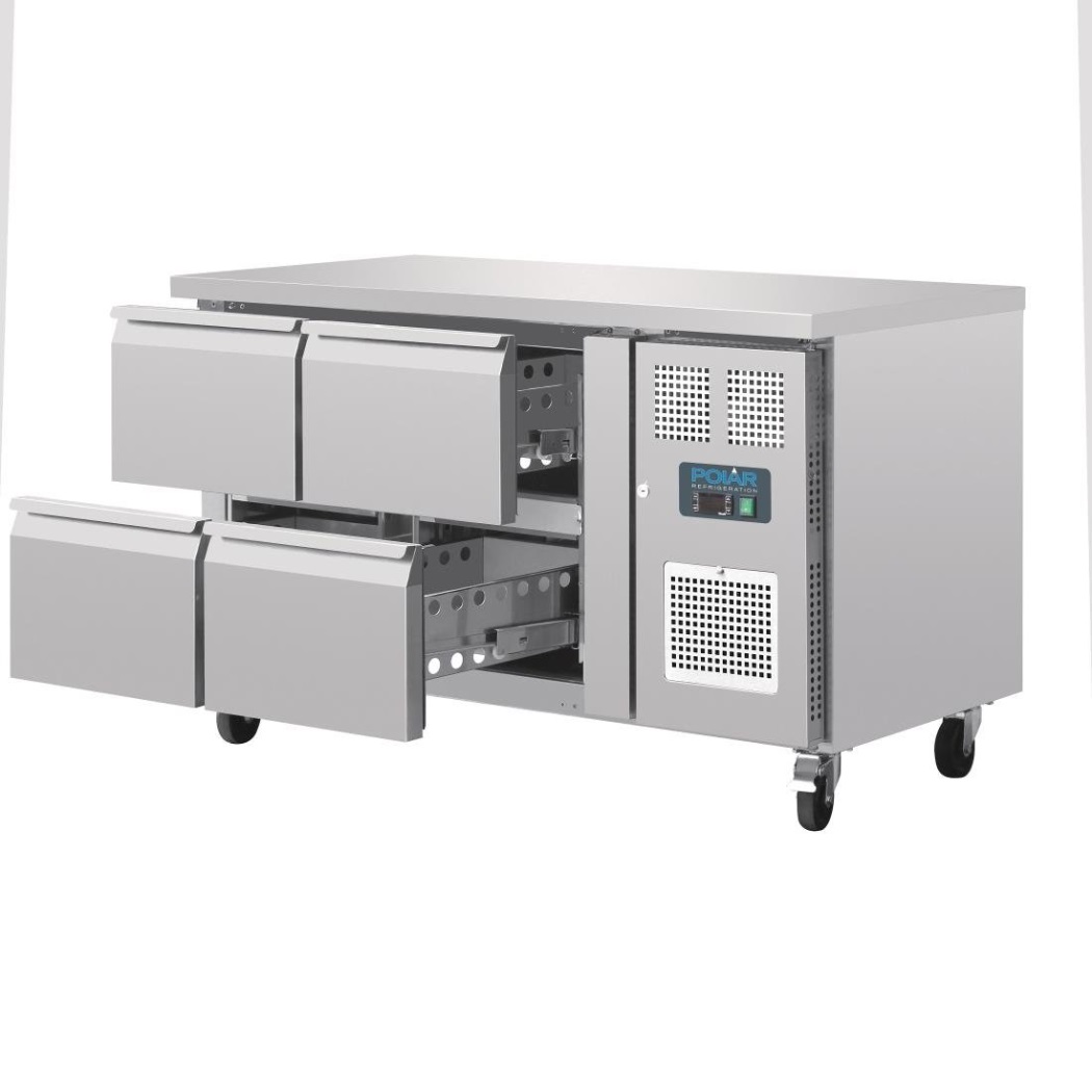 Mostrador refrigerado con cajones fabricado en resistente acero inoxidable.
