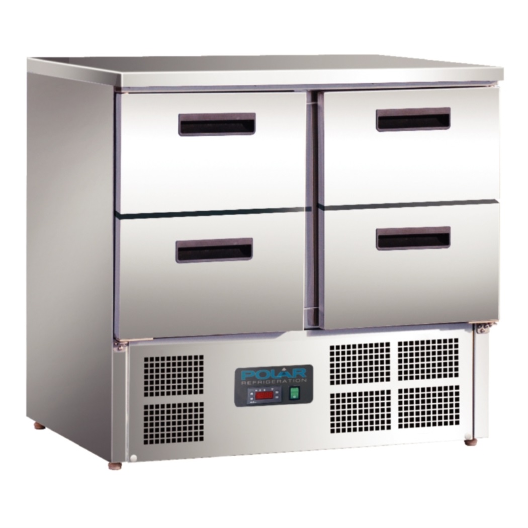 Mesa de trabajo refrigerada con encimera de acero inoxidable. Adecuado hasta 4 bandejas de profundidad GN 1/1 100mm. Compresor de ahorro de espacio situado en la parte inferior. Controlador totalmente automático equipado con pantalla digital. Descongelación ajustable con intervalo de tiempo. Es necesario descongelar manualmente el tiempo. CFC free.
